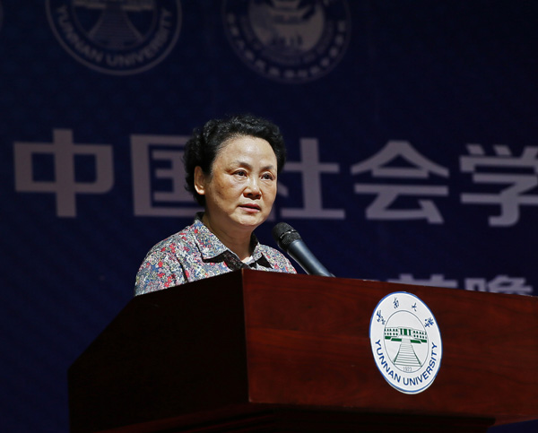 中国社会学会会长李友梅教授讲话。她回顾了中国改革开放40年来取得的举世瞩目成就,指出中国当代的社会转型是国内外因素相互影响下多线程互动的复杂进程。李友梅认为,中国社会学的重要任务是要建立一套可以实际地认识当代中国社会变迁和社会转型实践脉络的理论与方法,从而可以真正辨识中国社会变迁和社会转型的实践历程及其丰富独特性。李友梅还对云南大学在此次年会中付出的大量人力、物力表示感谢,并感谢北京市陆学艺社会学发展基金、社会科学文献出版社和得到APP等机构与企业对年会的大力支持。