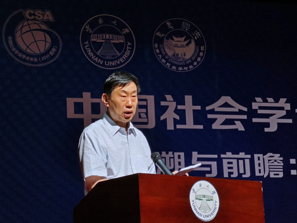 全国人大常委、中国社会学会学术委员会主任李培林研究员讲话。他首先对云南大学为此次年会付出的辛勤工作表示感谢,对与会专家学者表示热烈欢迎。他回顾了新中国成立70年来在人民生活水平、工业化与城镇化、人口结构与人口素质、反贫困、社会保障体系等方面取得的举世瞩目成就。他对中国社会正在发生的深刻转型进行了系统而精辟的总结并指出,中国社会在发展动力与发展资源环境、经济发展面临的困境、劳动力供求关系、贫富差距、老龄化等方面仍存在很大困难。李培林最后说,国家综合实力的提升与人民生活水平的持续快速提高才是国家发展的硬道理,是国家制度优越性的根本体现,是决定民心向背的关键所在,他呼吁广大同仁更加深入地进行社会调查和科学研究,为中国社会建设贡献新的力量。