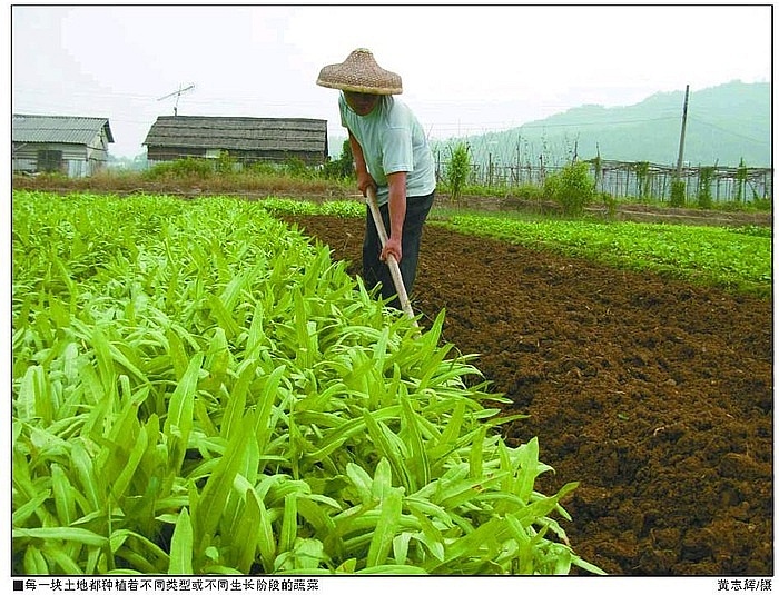 夫妻二人便是小“农场”中的全部劳力。他们需要完成包括翻耘、种植、收获、销售等在内的全部工作。平均每户菜农耕作的土地为4.2亩。每一块土地被分割成二三十个小块。除棚户外,每一小块都种植着不同类型或不同生长阶段的蔬菜。例如,广西何叔夫妇所租的3.5亩土地被分割成28块,种植了10种蔬菜。而每一种蔬菜又分成了种子区、幼苗区与成苗区,大概各占1/3的面积。当成苗区的蔬菜收获结束后,需要立即将其转换成种子区,并往复循环。这种土地分配构成了农业生产的流水线,使耕种的劳动投入与每日收获的农产品形成一个均衡的比例。