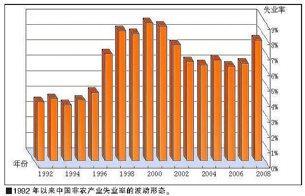 在1992—1996年的经济繁荣周期中,失业率维持在4%左右。从1997年开始,随着经济步入萧条,失业率快速攀升至6.9%,此后继续上升,并于2000年达到8.9%的峰值。在1997—2002年间,失业率在多数年份盘踞在8%以上的高位。2003年随着经济复苏,失业率回落至6.4%,在此后5年时间里,失业率虽有所降低,但一直维持在6%以上。总的来看,与1992—1996年的繁荣周期相比,2003—2008年繁荣周期的失业率抬高了近2%。